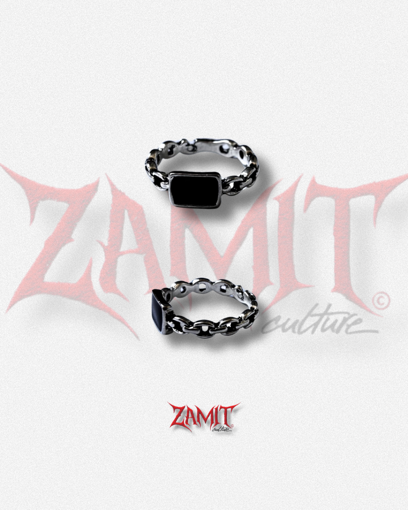 Anel com correntes nas laterais e topo com retângulo preto em destaque. O design combina textura e contraste, criando uma peça moderna que adiciona personalidade ao visual.