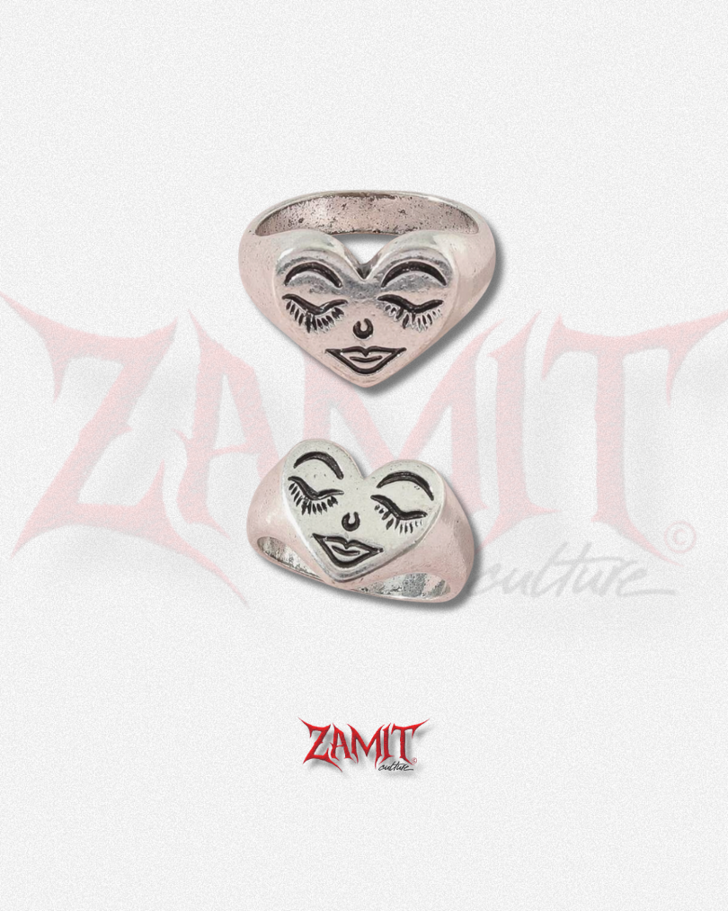 Anel em formato de coração com rosto triste desenhado, criando uma estética expressiva que mistura emoção e atitude urbana. O design traz um contraste interessante entre o símbolo clássico do coração e a expressão melancólica, resultando em uma peça cheia de personalidade.